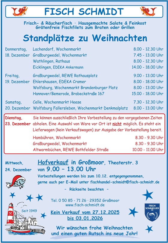 Bitte beachten Sie, dass der Verkauf unserer Produkte ausschließlich über unsere Verkaufswagen an den Standorten stattfindet. An den Verkaufswagen können Sie unseren Frischfisch und Salate bekommen oder auch vorbestellen.